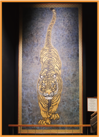 1階の壁面にはオスの「迎え虎」、2階にはメスの「送り虎」が描かれています。迎え虎は、どの位置から見ても真正面に見える「八方睨みの虎」といわれています。
