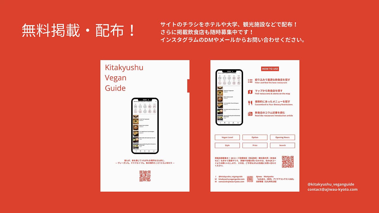 北九州市内のヴィーガン・ベジタリアン対応可能なメニュー情報を集約し、北九州版ウェブサイトを制作して、食の制約をもつ海外旅行者が旅前から安心して情報収集できるようにする。